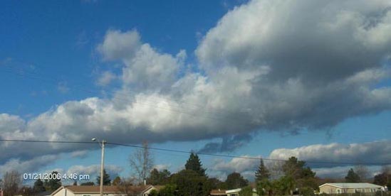 Clouds near Sebastopol, California—January 2006 We had gone to Sebastopol on the 21st January 2006. Beautiful long clouds were drifting across the sky. We were passing through countryside dotted with farm buildings, vast fields stretching out to the horizon and leafless trees standing black and dramatic against the sky. The bursts of sunshine made you feel as if spring was on the way at long last—though we must have at least another month of winter ahead of us. |