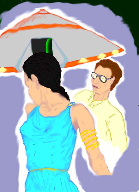 Signs & PortentsChapter 17 What the Vintners BuyLike many another rational introvert, Morton Wilson had always considered himself as sort of out of step socially, but this was changing. He found himself blossoming under the favorable attention he was receiving in his new job. He had never honestly imagined achieving recognition in his chosen field, solar radiation, but recognition had literally sought him out in what he had thought to be an obscure job, taken only because of a difficult job market. When he had first taken the job, he had supposed it to be a dead end sort of thing, His only area of uncertainty had been exactly when it would be quietly phased out and the marvelous paychecks would stop arriving. To his surprise, and finally relieved gratification, he discovered that both funds and people were gravitating to this gesture, if such it was, while other areas of research in the sciences went lean or were totally starved out. It was a changing world. He was on his way home from attending a late evening barbecue at the suburban ranch of a colleague. He had enjoyed the gathering, but it had been abruptly rained out, and he had joined the race for shelter, and amid the laughter and hot coffee, had suddenly realized that he was truly happy for the first time in his life that he could recall. On this sublime pinnacle, he meditated, as he guided his hand painted classic microbus through the rain on the highway home. He wiped at the fog on the windshield and wished his windshield wipers were working better. Gradually, the sensation that the road looked unfamiliar began to nag at him. Could he have taken a wrong turn in the rain? As he drove on, the rain began to lift, revealing that this dark stretch of highway was completely deserted except for his own vehicle. Dismay wrenched at him when the interior of the bus was suddenly flooded with red light and a flash of amber revealed itself in the rearview mirror. A cop? Well, he had not been speeding, vintage microbuses were incapable of it, but assorted probabilities crossed his mind. Could it be the tail lights were out again? He quickly maneuvered the bus onto the shoulder of the road. Everything was quiet when he shut off his motor. He looked back, but saw no patrol car. What the hell had happened? He must have driven past some sort of unusually vivid illuminated signal light, he decided. Well, now that he was stopped, he could take a minute to check those tail lights. As he reached the back of the bus, a vision of wonder came gliding silently and serenely over him. His mind recoiled, "Oh, no," it pleaded, "not that!!" But "that" continued to be true, an enormous disk flashing amber and red, then green and blue, somehow awash in white on a silvery metallic body, drifted down in front of the bus. Morton debated trying a quick getaway down the road in the opposite direction, but found his feet frozen to the ground and his knees too unsteady. I am a scientist, his inner dialogue insisted sternly. If this is what it is, this is what it is. The memory of a laugh he had had with some friends about this very subject rose up to haunt him, the joke had concerned "Our Lady of Space." What a thing to remember, and at a time like this, his inner mentality scolded, unnerved at the prospect of being overheard telepathically. "Our Lady of Space" had just appeared in the opening that had quietly seamed open in the hemispheric shape. All was dark and pregnant with mystery behind her. But she, herself, shown radiant in the white glow from the hull, dressed in a shimmering float of iridescent material caught very simply in some sort of intricate pleating over both shoulders. A gold rope wound around a slender and curvaceous waist, caught the cascade of pleats briefly, leaving the rest swirling around her. Her sandals appeared to be intricately woven of the same gold cord. She was a complete fantasy figure, rather like a fairy grown full size and alive. Morton took all this in, congratulating himself on the detail he was memorizing in what seemed interminable seconds. Time had slowed, or perhaps stopped altogether from Morton's point of view. Of course, it couldn't be true, his mind reassured him, flying saucers and visitors and things like that were only a fad dreamed up by the mass mind. But now, it was happening to him. Something was happening, he sternly corrected himself, "it" took on a grotesque implication. A redeeming theory angled through his mind. Was there some chance he had landed in the middle of the making of a low budget science fiction movie? It was an appealing solution, but in his heart, he knew it was not true. When the vision spoke, his ability to endure additional novelty snapped. His ears were unable to break down the sounds into meaningful words, so he heard only gibberish. But something in his brain screamed "English!" It was the final assault on reason that she spoke English. His mind closed down. His mouth opened and he attempted to voice a protest, but giggled loudly and ludicrously instead. As though comprehending his difficulty, the lady fixed him with a dignified but patient look. She spoke again, it was oddly lilted, strangely accented English, but this time he heard. "I am Tisifoni," she said "T'siff'o'nee of the Eumenides." "It means kindness." she smiled patiently at him, her manner friendly and casual, "Come!" Morton walked to the ship, vaguely surprised that his initial diffidence had vanished. He had the feeling now that he had come home somehow, and everything was at last clear and complete. Aboard the saucer, Morton's mind finished its recovery from its first shock, and he accepted where he was and the whole situation calmly. He was a very fortunate man again. He greeted the discovery that the ship was inhabited by not one, but three ladies with only pleased surprise. Their names were difficult to pronounce, but of course, that would naturally be, as they came from a far away civilization in the Hyades. The first was T