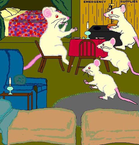 ![]() ![]()   A family of white mice called the Bobbingtons were just sitting down to a snack behind the wainscot when the floorboards gave a shudder. Unknown to them, Uncle Arthur had just tumbled into bed. They looked on in amazement as the plates and jugs started wobbling and the tiny iced cakes leapt into the air.   "Whoops," said Ma Bobbington, as she reached out to save the cakes from bouncing on to the floor, "who is shaking the table?"   "Not me," said a startled Alf.   "Listen," said Em,"the floorboards are groaning."   There was a sudden whooshing sound and the next minute they were covered in a shower of dust which had blown down from the ceiling.   "Oh dear,"Ma gasped, "it must be an earthquake."   "Come on," said Pa Bobbington, "down to the shelter!"   And the four Bobbingtons raced through the maze of corridors behind the wainscot until they arrived breathless and shaking at the shelter deep beneath the foundations of the house. In the safety of the shelter, they lit the emergency oil lamps and sat wide eyed on the little sofa. They pricked their ears, listening intently. Far above them, they could hear the timbers of the house creaking and groaning as if a winter storm was buffeting the house.   "Well," said Pa Bobbington shaking his head in disbelief, "this is a pretty kettle of fish and no mistake. Who would have thought that such things would happen again in our time?"  "You mean," said Alf, "that something like this has happened before?" |