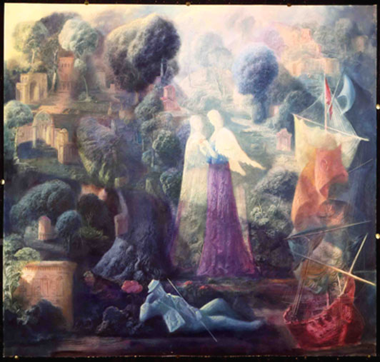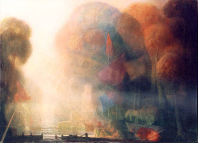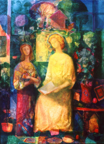 Samuel Palmer was 'a man born out of his time.' Both he and Hitchcock had intense epiphanies, or mystical experiences in rural England. In both cases this experience entered their inner lives, and became an impulse that sustained and powered their art. Both men, perhaps because of these experiences, placed the intuition, or the imagination, high above the intellect. Unlike Palmer, however, whose visionary period lasted six years (and unlike van Gogh, perhaps, who arrived in Arles in 1888 and shot himself three years later after one of the most intensely creative phases in the history of art)—Hitchcock has been able to sustain and develop his vision over a period of decades. This intuitive sense of another world, another time, occurs frequently in people's responses to Hitchcock's paintings. It's as though we retain a vague memory of a golden age, which is what his paintings could be said to evoke or revive. This golden age, perhaps, is our Dream Time, to borrow a phrase from the aborigines. Hitchcock himself says, "I've always had this feeling that the Golden Age exists. It's an era that is alive in everyone."