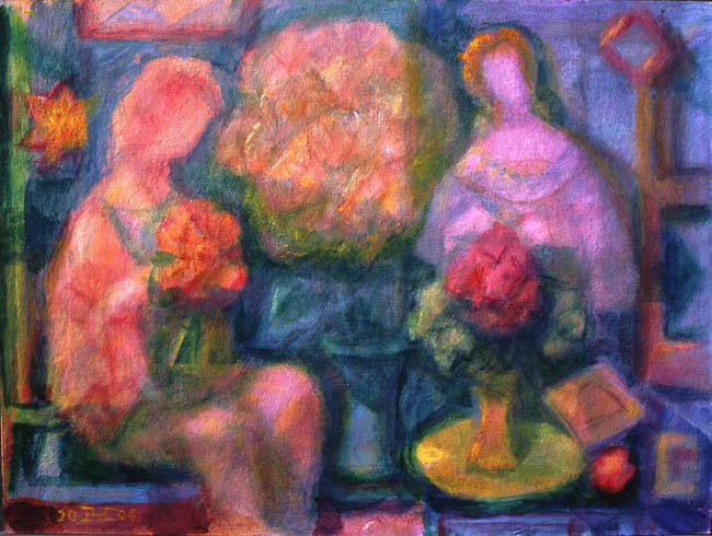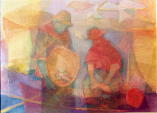 'Figures In A Garden' 2004 9ins. x 12ins. Acrylic on paper Hitchcock's paintings have been acclaimed by a number of prominent writers and critics including Lord Kenneth Clark, Sir Roy Strong [who, as director of the Victoria and Albert Museum asked Harold if he would donate a painting to the museum], Sir Laurens van der Post, Paul Gallico, Christopher Wright, and John Russell Taylor [of The Times]. He has been awarded several distinguished honors including a Fellowship in the Royal Society of Arts [where he was accorded the rare honour of a retrospective exhibition of his work in 1984]. His paintings are hung in significant public and private collections in England, Scotland, Japan, the United States, France, Germany, Switzerland, the Netherlands, and Czechoslovakia and has had exhibitions in some of the major London galleries. Since the late 1980s he has exhibited mainly in the USA. He is listed in Benezit.