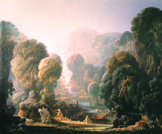 'Sunrise In A Valley' 1974 40ins. x 60ins. Oil on canvas Here are comments made by others, beginning with two tributes from one of the greatest art critics of the twentieth century—Lord Kenneth Clark: 'I can tell you sincerely that I am very much moved and impressed. It is rare to find an unashamedly romantic and literary artist. All criticism in the first half of the century was against them, so I not only admire Hitchcock's poetical imagination, but also his courage in persevering in his true style.' "He really is a most extraordinary artist. One can look at his work for a long time and find each time a great deal that is new."—Lord Clark 'I applaud the force and intensity of Hitchcock's vision and the skill with which it is captured on canvas.'—John Russell Taylor, The Times. 'He is truly remarkable—a phenomenon whose contact with the unconcious patterns of art is really unique and I am so happy that the V&A have seen the light and acquired some of his work.' —Sir Laurens van der Post '...beneath the bejewelled surface there is always an ingenious, dedicated intelligence at work, developing and resolving complex formal problems.' —Julian Bell '...much of his work has a kind of fairy tale quality and escape into a world of peace and beauty...' —The Duke of Bedford '...the light is alive. It blazes and shimmers in painting after painting, illuminating corners of the darkest forest. Not since Monet has a painter been absorbed by light as Hitchcock is—he paints it with a technical mastery that leaves other painters amazed.'—Shirley Deane 'To use a musical parallel, he is a mixture of Delius and Mozart. On the surface there is a soft and trance-like quality, with everything suggested and nothing emphasized. But just underneath this surface—which one feels can be peeled off like a skin—the structure of the composition is firm as a rock and the detail hard as a diamond.' —Gordon Brooke-Shepherd.