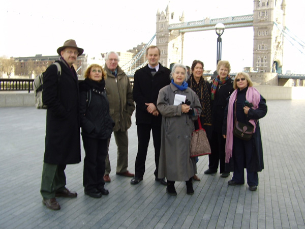 Mairi Store, a retired, Blue Badge Tour Guide, leads a group of people on a walk that takes in many historical places by the Thames in south London. She says, "...it was a great walk. The weather was kind although a bit chilly. and most of us ended up in one of the River Pubs for lunch and left about 4:00 p.m. and I think a very good day was had by all." We all met up at City Hall or "Ken's Palace," beside the river Thames, facing wonderful views of The Tower of London, Tower Bridge and the Customs House. Mairi Store (Chair of SICA Britain) explained that the reason for the lop-sided spiral shape of City Hall was to make the most of the sunlight and so it wouldn't cast a shadow over the pedestrian area. It was designed in a very environmentally friendly way. The water in the cooling system can be used again for flushing the toilets, and the heating comes from the computers used in the building. We then went onto Hay's Galleria, which was once a riverside wharf. The original wharf was much bigger than just Hay's Galleria, it stretched from the Galleria to near where London Bridge hospital is located. In by gone times the whole area was known as London's Larder. Today, it's the area known as London Bridge City. We walked through Southwark, where we saw the replica of the Golden Hind and Southwark cathedral, and heard the story of St. Mary Overy before she entered the convent. On to the Borough, which historically, has been independent of the City of London. Here we heard tales of the ladies of the night in their "stews," tempting the wealthy gentlemen across the river; and the tale of the ferryman's seat where he sat waiting to ferry the men back across the river after curfew—for a good price. ![]()