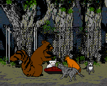 Frightened that the raccoon might attack the cats, Stephanie tried to shoo him off. The approaching cat shooed very nicely, almost leaping into the raccoon's arms. Shooing was obviously not the way. The cat, getting up its nerve again, came a little reproachfully for his food.