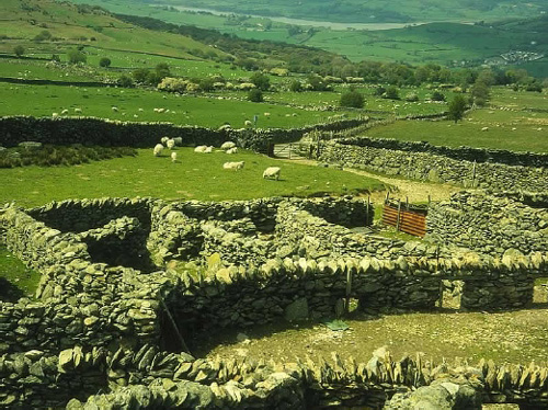 stone, but all traces of these have long gone. Even where they seem to have had no stone walls, however, they often boasted a circular surround of flat rocks to catch and deflect the rain dripping off the thatch—the historical "eaves-drip" from which we get the expression, "eaves-drop", implying that someone is standing close enough to the hut to hear what is going on inside. The Snowdonia National Park offers many opportunities to explore ancient Stone Age sites, the remains of villages which once flourished, where for thousands of years, perhaps, generation after generation of family members lived and died. Only when the weather became too harsh to sustain their way of life did the villages themselves falter and die. This is the basic reason why Stone Age remains of this nature seem confined to the high, rocky ground: In the lowlands and valley bottoms they have all been dug out, ploughed over, built on, and lost forever. In Wales as in other Celtic lands, you might marvel at the extent, the sheer substantiality, of the stone walls. Mile upon mile of broad, high drystone walls running up and over the steepest of hills, separating fields and farms large or small, doubled up to mark the parallel boundaries of track, lane, or main road. They epitomize the territory of the raven and the buzzard. They do not employ neat little quarried pieces of stone such as you might see in the Cotswolds, but great, rough lumps of rock as they were turned up by the plough or spade, or dumped by a glacier, or rolled down the scree from an eroding mountain top. Wales is a small country, but the proportion and sheer impact of stone walls throughout the land is vast. What an enormous sum-total of effort accumulated over the centuries! Several people have told me something about the history of these walls— or perhaps not history, perhaps just a folk-memory, or perhaps no more than a tongue-in-cheek yarn to fool the Saeson. But this is it: During the Bronze Age and the Iron Age, before the Romans came and built their forts, and before the Anglo-Saxons claimed Lloegr as their own, the British tribes had a great hobby, more than a leisure activity, more of a side-line profession. They raided each other. There was no malice in it, everybody did it; it was simply what they did: they drove off any cattle that could not be penned in time into one of the hill forts (and it was cattle in those days, not sheep as it is today), and they captured any suitable people they could find to bring them back as slaves. And why did they want to make slaves of each other? Why, to build their stone walls, of course.